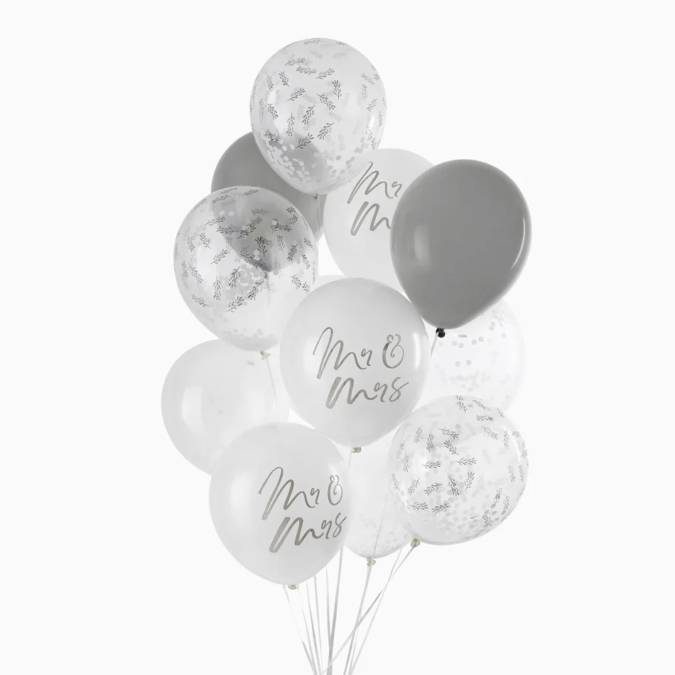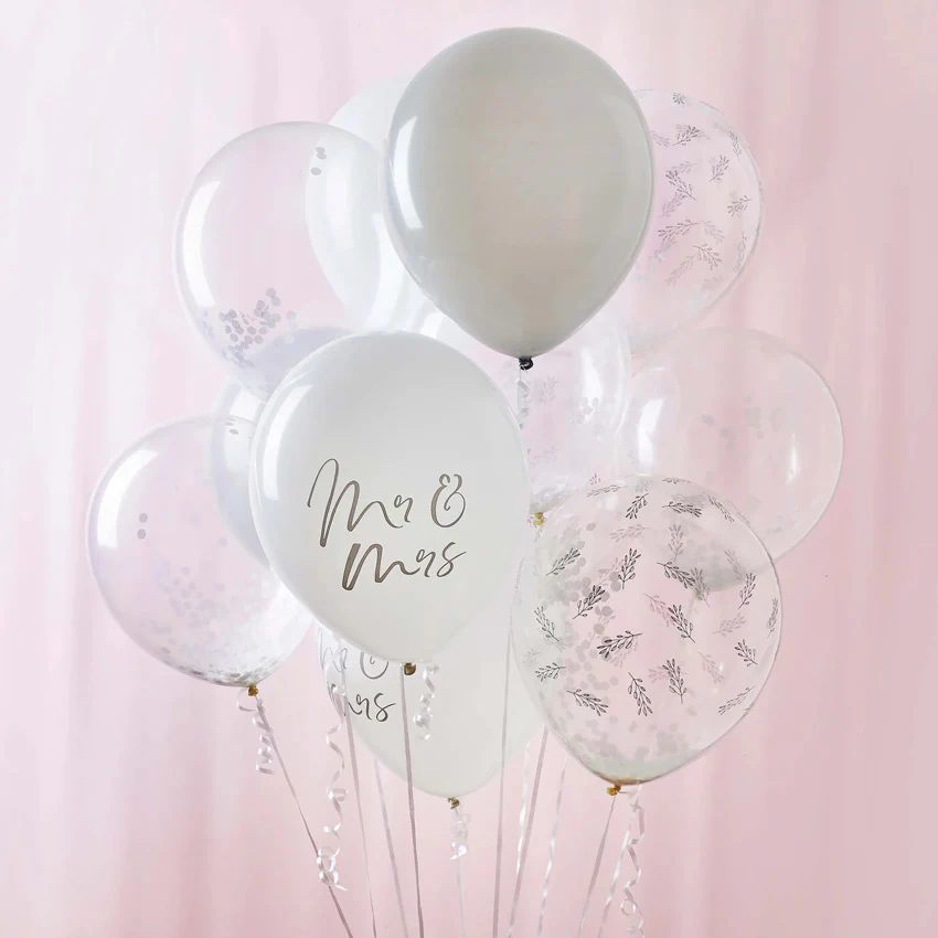 • 3 Globos blancos con la frase «Mr & Mrs» en color gris.